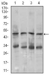 Figure 2: Western blot analysis using CHGA mouse mAb against MOLT4 (1), SK-N-SH (2), HepG2 (3), and PC-12 (4) cell lysate. |