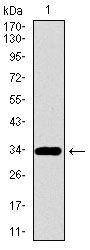 Figure 1: Western blot analysis using PAX3 mAb against human PAX3 recombinant protein. (Expected MW is 32.6 kDa)
