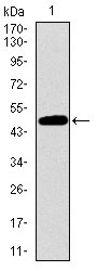 Figure 1: Western blot analysis using TP53BP1 mAb against human TP53BP1 recombinant protein. (Expected MW is 47.6 kDa)