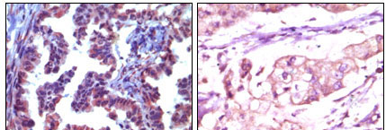 Figure 2: Immunohistochemical analysis of paraffin-embedded human metastatic adenocarcinoma(A) and stomach adenocarcinoma (B), showing cytoplasmic localization using Trim5α mouse mAb with AEC staining (A) and DAB staining(B).