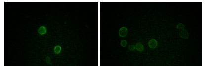 Figure 2: Immunofluorescence analysis of methanol-fixed L-02 (left) and Cos7 (right) cells using ApoM mouse mAb showing cytoplasmic and membrane localization. |