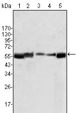 Figure 1: Western blot analysis using LYN mouse mAb agains HL60 (1), L540 (2), SLLP-M2 (3), SEM (4) and Ramos (5) cell lysate. |