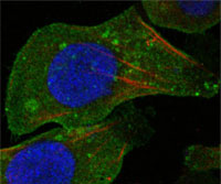Figure 3: Confocal immunofluorescence analysis of A549 cells using DDR2 mouse mAb (green). Red: Actin filaments have been labeled with DY-554 phalloidin. Blue: DRAQ5 fluorescent DNA dye. |
