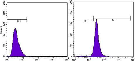 Figure 3: Flow cytometric analysis of MCF-7 cells using beta Actin mouse mAb (right) and negative control (left).