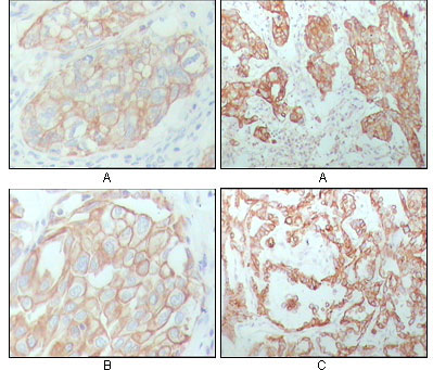 Figure 2: Immunohistochemical analysis of paraffin-embedded human breast carcinoma (A), lung cancer (B) and ovarian cancer tissue (C), showing membrane and cytoplasmic localization with DAB staining using CK8 mouse mAb.
