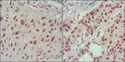 Figure 2: Immunohistochemical analysis of paraffin-embedded human lung cancer (left) and cervical carcinoma (right), showing nuclear localization using ISL1 mouse mAb with DAB staining.