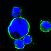 Figure 3: Confocal immunofluorescence analysis of HEK293 cells trasfected with full-length ISL1-hIgGFc using ISL1 mouse mAb (green). Blue: DRAQ5 fluorescent DNA dye. |