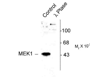 MEK 1 (MAP Kinase Kinase, also known as MKK) is an integral component of the MAP kinase cascade that regulates cell growth and differentiation (Ahn, 1993; Chong et al., 2003). This pathway also plays a key role in synaptic plasticity in the brain (Adams and Sweatt, 2002). Activated MEK 1 acts as a dual specificity kinase phosphorylating both a threonine and a tyrosine residue on MAP kinase (Kyriakis et al., 1991; Seger et al., 1991; Crews et al., 1992). Conversely, there also appears to be a feedback phosphorylation of MEK 1 by MAP kinase. The sites on MEK 1 that are phosphorylated by MAP kinase are Thr292 and Thr386 (Mansour et al., 1994).
