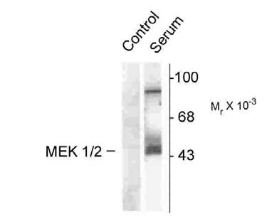 Western Blot of NIH 3T3 cell lysates showing specific immunolabeling of the ~45k MEK 1/2 protein phosphorylated at Ser218 and Ser222. The cells were either serum starved (Control) or incubated in the presence of serum (Serum). Immunolabeling of an additional band at ~95k was also observed. |