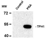 Western blot of recombinant tryptophan hydroxylase incubated in the absence (Control) and presence of cAMP-dependent protein kinase (PKA) showing specific immunolabeling of the ~53k tryptophan hydroxylase protein phosphorylated at Ser58. |