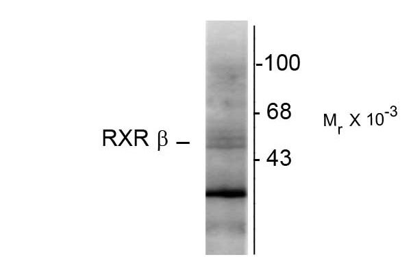 Western blot of rat hippocampal lysate showing specific immunolabeling of the ~48k RXR-β protein. |