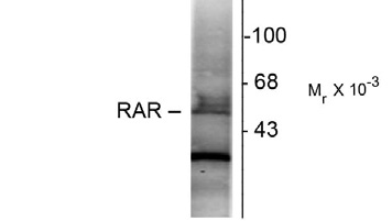 Western blot of rat hippocampal lysate showing specific immunolabeling of the ~48k RAR-α protein. |