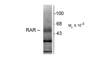 Western blot of rat hippocampal lysate showing specific immunolabeling of the ~48k RAR-β isotype. |