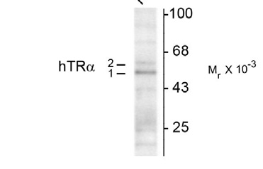 Western blot of rat hippocampal lysate showing specific immunolabeling of the ~50k TR-α1 and the ~58k TR-α2 protein. |