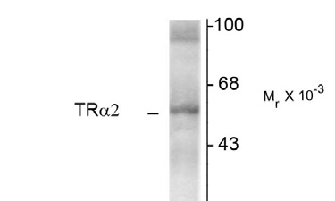 Western blot of rat hippocampal lysate showing specific immunolabeling of the ~58k TR-α2 protein. |