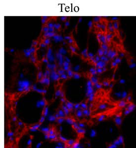 Immunostaining of formaldehyde-fixed fibrotic mouse lung tissue. The antibody recognizes mature collagen I (red) that has formed fibrils in the extracellular matrix. |