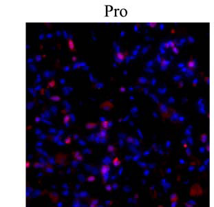 IHC of fibrotic mouse lung tissue showing specific staining of collagen I molecules (red) that are still associated with the cells in which they were synthesized. |