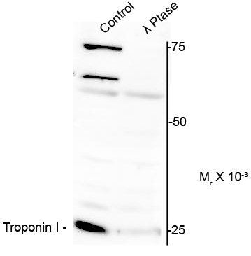 Western blot of mouse heart lysate showing specific immunolabeling of ~25k cTnI protein phosphorylated at Ser150 (control). Phosphospecificity is shown in the second lane (lambda-phosphatase: λ-Ptase). The blot is identical to the control except that the lysate was incubated in λ-Ptase (1400 units for 30 min). The immunolabeling is greatly decreased by treatment with λ-Ptase. |