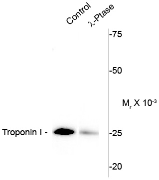 Western blot of mouse heart lysate showing specific immunolabeling of the ~25k cTnI protein phosphorylated at Ser43 (control). Phosphospecificity is shown in the second lane (lambda-phosphatase: λ-Ptase). The blot is identical to the control except that the lysate was incubated in λ-Ptase (1400 units for 30 min). The immunolabeling is greatly decreased by treatment with λ-Ptase. |