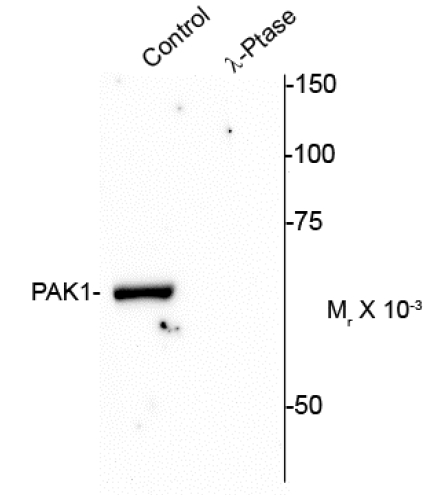 Western blot of mouse hippocampal lysate showing specific immunolabeling of the ~68k PAK1 protein phosphorylated at Thr84 (control). Phosphospecificity is shown in the second lane (lambda-phosphatase: λ-Ptase). The blot is identical to the control except that the lysate was incubated in λ-Ptase (800 units/1mg proteinfor30min).Theimmunolabelingiscompletelyeliminatedbytreatmentwithλ-Ptase. |