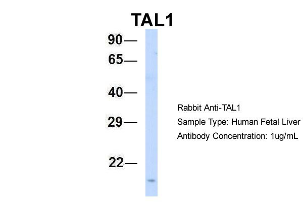 TAL1 antibody - N-terminal region (APR00551G) in Hum. Fetal Liver cells using Western BlotHost:Rabbit Target Name:TAL1 Sample Tissue:Human Fetal Liver Antibody Dilution: 1.0μg/ml