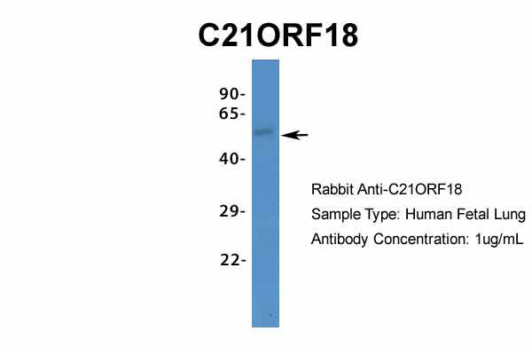 Host: Rabbit Target Name: C21ORF18 Sample Tissue: Human Fetal Lung Antibody Dilution: 1.0μg/ml |