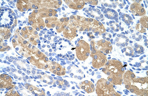 Rabbit Anti-RAE1 Antibody Paraffin Embedded Tissue: Human Kidney Cellular Data: Epithelial cells of renal tubule Antibody Concentration: 4.0-8.0 μg/ml Magnification: 400X