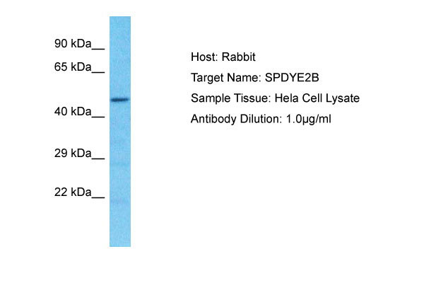 Host: Rabbit Target Name: SPDYE2B Sample Tissue: Hela Whole cell lysates Antibody Dilution: 1.0μg/ml |