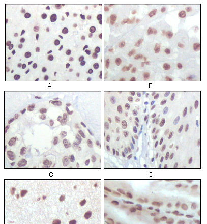 Figure 2: Immunohistochemical analysis of paraffin-embedded rat liver tissue (A), human brain tumor (B), breast cancer (C), esophageal epithelium tissue (D), mouse brain tissue (E) and stomach tisue (F), showing nuclear localization using P16 mouse mAb with DAB staining. |