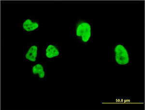 Immunofluorescence of monoclonal antibody to RUNX2 on HeLa cell (antibody concentration 10 ug/ml).