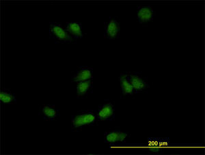 Immunofluorescence of monoclonal antibody to CSE1L on HeLa cell (antibody concentration 10 ug/ml).