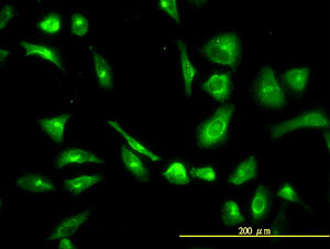Immunofluorescence of monoclonal antibody to CPVL on HeLa cell (antibody concentration 10 ug/ml).