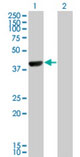 Western blot of CAMK1D expression in transfected 293T cell line by antibody AMM02115G.