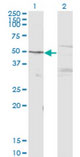 Western blot of MAPK8 expression in transfected 293T cell line by MAPK8 monoclonal antibody,...