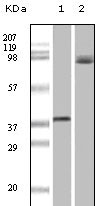 Figure 1: Western blot analysis using BRAF mouse mAb against truncated recombinant Braf (1) and A431 cell lysate (2).