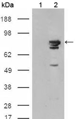 Figure 2: Western blot analysis using BRAF mouse mAb against HEK293T cells transfected with the pCMV6-ENTRY control (1) and pCMV6-ENTRY Braf cDNA (2).