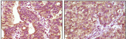 Figure 3: Immunohistochemical analysis of paraffin-embedded human bladder carcinoma tissue(left) and lung carcinoma tissue (right) showing cytoplasmic localization using BRAF mouse mAb with DAB staining. |