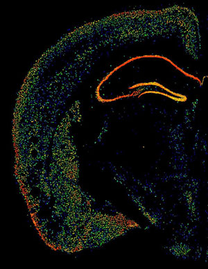 Glutamate Receptor (Metabotropic) Type 5 (mGluR5) mGluR5-staining of pyramidal and granule cell neurons in the hippocampal formation of an adult transgenic mouse brain (red staining); Green staining is GFP-immunoreactivity under the control of a constitutive actin promoter.</p> |