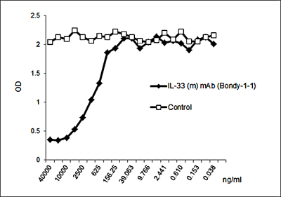 Binding of IL-33 (mouse) to ST2/IL-1RAcP is inhibited by IL-33 (mouse), mAb (rec.) (blocking) (Bondy-1-1). Methods:IL-33 (mouse) was coated on an ELISA plate at 1ug/ml. IL-33 (mouse), mAb (rec.) (blocking) (Bondy-1-1) or an unrelated mAb (recombinant) (Control) were added (starting at 40ug/ml with a twofold serial dilution) together with 100ul of supernatant of cells containing ST2 (human):Fc/IL-1RAcP (human):Fc. After incubation for 1h at RT, the binding was detected using an anti-Fc human antibody (HRP). |