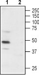 Western blot analysis of rat DRG: 1. Anti-P2X3 Receptor (extracellular) antibody (APR00492G), (1:200). 2. Anti-P2X3 Receptor (extracellular) antibody, preincubated with the control peptide antigen.