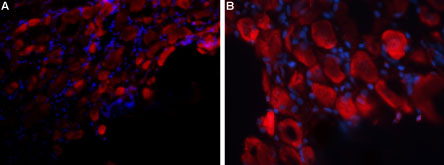 Expression of P2X3 Receptor in rat DRG Immunohistochemical staining of rat dorsal root ganglion (DRG) frozen sections using Anti-P2X3 Receptor (extracellular) antibody (APR00492G), followed by anti-rabbit-AlexaFluor-594 secondary antibody. P2X3 Receptor staining (red) appears in neuronal cell bodies. DAPI was used as the counter stain (blue). A. X20 magnification. B. X40 magnification.
