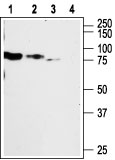 Western blot analysis of differentiated (lanes 1 and 3) and non-differentiated (lanes 2 and 4) PC12 cell lysates: 1, 2.Anti-P2X2 Receptor antibody (APR00494G), (1:200). 3, 4.Anti-P2X2 Receptor antibody, preincubated with the control peptide antigen.