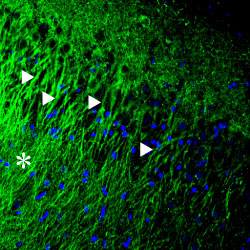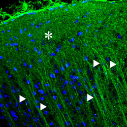Expression of P2X2 Receptor in rat neocortex Immunohistochemical staining of rat neocortex with Anti-P2X2 Receptor antibody (APR00494G). P2X2 Receptor (green) appears in axonal processes (arrows) that ascend toward the upper cortical layers (asterisk). DAPI is used as the counterstain (blue).