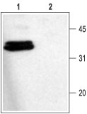 Western blot analysisof rat brain membranes: 1. Anti-Syntaxin 1 antibody (APR00501G), (1:1000). 2. Anti-Syntaxin 1 antibody, preincubated with the control fusion protein antigen. |