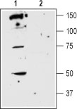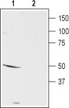 Western blot analysis of mouse brain membranes: 1. Anti-D5 Dopamine Receptor (extracellular) antibody (APR00506G), (1:200). 2. Anti-D5 Dopamine Receptor (extracellular) antibody, preincubated with the control peptide antigen.