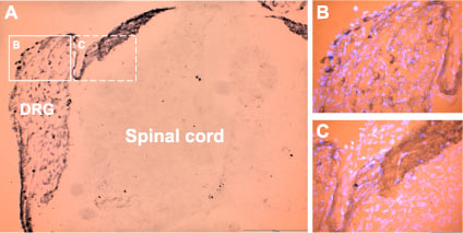 Expression of P2X3 Receptor in rat DRG neurons Immunohistochemical staining of rat dorsal root ganglion (DRG) neurons with Anti-P2X3 Receptor antibody (APR00514G), (A). Cells within the DRG were stained (see solid line frame enlarged (B) as well as fibers and the area of entry of dorsal root into spinal cord (see dashed line frame enlarged (C). DAPI is used as the counterstain (in B and C). |
