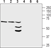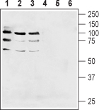 Western blot analysis of rat heart lysate (lanes 1 and 4) mouse heart membranes (lanes 2 and 5) and mouse brain lysate (lanes 3 and 6):1-3.Anti-Neuregulin-1 (extracellular) antibody (APR00522G), (1:200).4-6. Anti-Neuregulin-1 (extracellular) antibody, preincubated with the control peptide antigen.