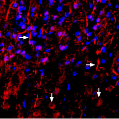 Expression of Neuregulin-1 in rat neocortex Immunohistochemical staining of perfusion-fixed frozen rat brain sections using Anti-Neuregulin-1 (extracellular) antibody (APR00522G), (1:1000), followed by anti-rabbit-biotinylated antibody and streptavidin-Cy3 (red). Neuregulin-1 staining isstrong in processes of various cell types (horizontal arrows) and less intense in neuron-shaped soma (vertical arrows). Nuclei are stained with DAPI (blue). |