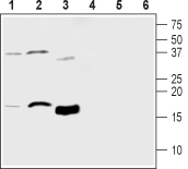 Western blot analysis of mouse brain lysate (lanes 1 and 4), rat brain lysate (lanes 2 and 5) and human recombinant MANF protein (lanes 3 and 6):1-3.Anti-MANFantibody (APR00524G), (1:200).4-6. Anti-MANF antibody, preincubated with the control peptide antigen. |