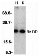 Western blot analysis of RAIDD in whole cell lysates from HeLa (H) or K562 (K) cells with RAIDD antibody at 1:500 dilution.
